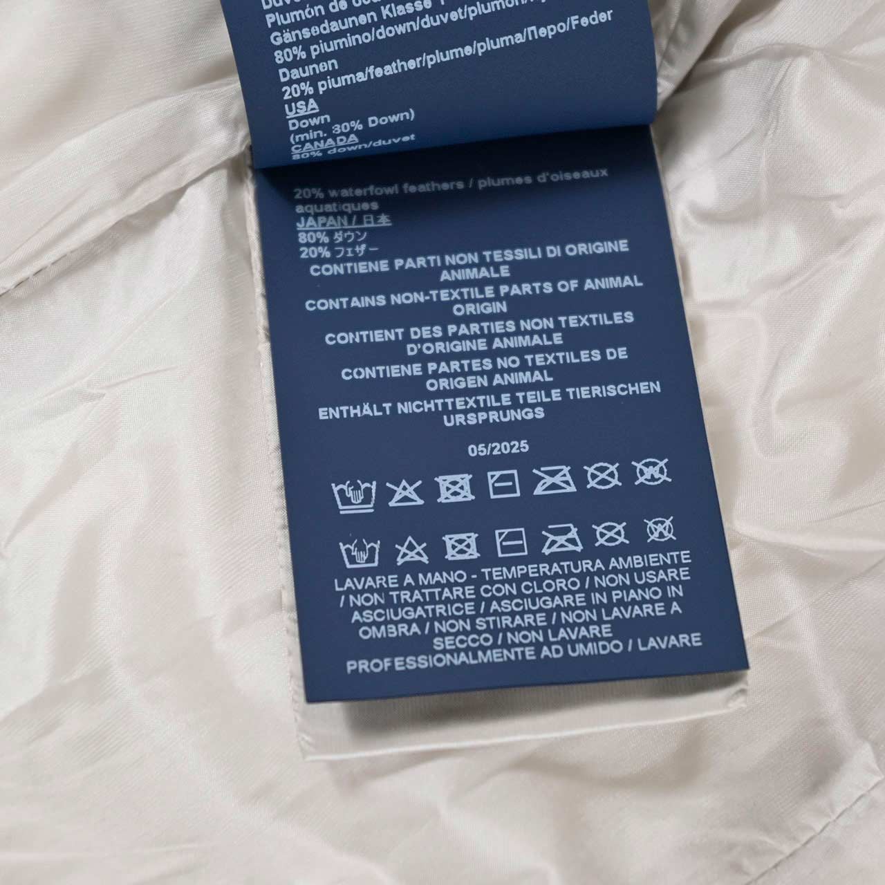 - 表地ポリエステル100%、裏地ナイロン100%、ダウン80%、フェザー20%